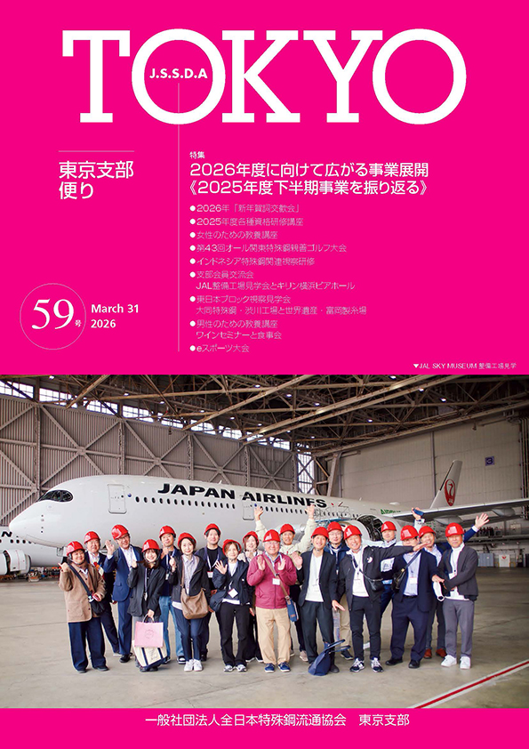 東京支部便り Vol.59 2026年3月31日 PDF 2026年「新年賀詞交歓会」 2025年度各種資格研修講座 女性のための教養講座 第43回オール関東特殊鋼親善ゴルフ大会 インドネシア特殊鋼関連視察研修 支部会員交流会 JAL整備工場見学会とキリン横浜ビアホール 東日本ブロック視察見学会 大同特殊鋼・渋川工場と世界遺産・富岡製糸場 男性のための教養講座 ワインセミナーと食事会 eスポーツ大会